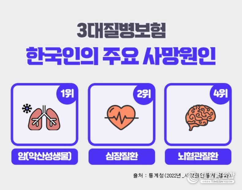 데일리연합 (SNSJTV) 임재현 기자 | 흔히 3대질병이라 일컫는 암, 심혈관질환, 뇌혈관질환은 통계청 발표자료에 따르면 한국인의 주요 사망원인 중에서 3위 폐렴을 제외하고 1~4위를 차지하고 있으며, 이전부터 지금까지도 살면서 가장 먼저 대비해야 하는 치명적인 질병으로 강조되고 있다. 이러한 중대질병에 대비하기 위하여 상기 세가지 치명적인 질병을 집중보장하는 3대질병진단비보험을 많이 가입하고 있다. 3대진단비보험은 각각의 질병을 중점적으로 보장하면서도 가입자 특성에 맞는 특약을 추가함으로써 종합건강보험으로도 활용할 수가 있다.
