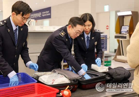 데일리연합 (SNSJTV) 김민제 기자 | 관세청은 22일 이명구 관세청장이 인천공항을 찾아, 여행자 휴대품 검사관들과 함께 우범 수하물 선별 및 개장검사, 우범여행자 신체 및 밀리미터파 검색기 운용 등 마약 검사업무를 직접 수행하며 여행자 분야 마약 단속 현장을 점검하고, 지난 5일 발표한 ‘관세청 마약 단속 종합 대책’의 철저한 이행을 주문했다고 밝혔다.