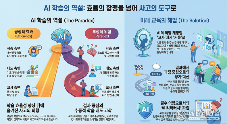 한국 교육이 ‘AI 학습의 역설’을 넘어서는 조건은 분명하다. 평가 혁신 없이는 AI 교육도 본질적 성과를 내기 어렵다는 점이다. 결과 중심 평가가 유지되는 한 AI는 학습 도구가 아니라 편법 수단으로 인식될 가능성이 높다. 아울러 학교 현장의 혼란을 줄이기 위한 국가 차원의 AI 활용 가이드라인 정립과, AI의 한계와 오류를 인식하고 비판적으로 검증하는 교육의 조기 도입이 요구되고 있다.