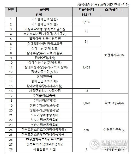조기지급 대상은 생계급여와 주거급여를 비롯해 장애수당·장애인연금, 입양아동 양육수당, 자립준비청년 자립수당, 가정위탁아동 양육수당, 한부모가족 지원, 사할린동포 지원 등 총 4개 부처 소관 28종 복지급여로, 보건복지부·국토교통부·성평등가족부·재외동포청이 함께 참여한다.