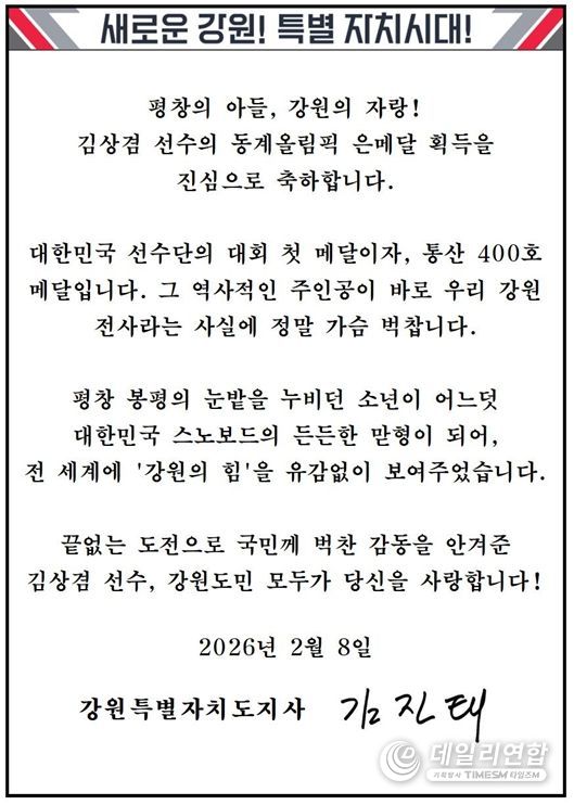 데일리연합 (SNSJTV) 이기삼 기자 | 김진태 도지사는 8일 2026 밀라노-코르티나담페초 동계올림픽대회에서 강원특별자치도(하이원 스포츠단) 소속 김상겸 선수의 남자 스노보드 평행대회전 은메달 획득을 축하하며, 축전을 보냈다.