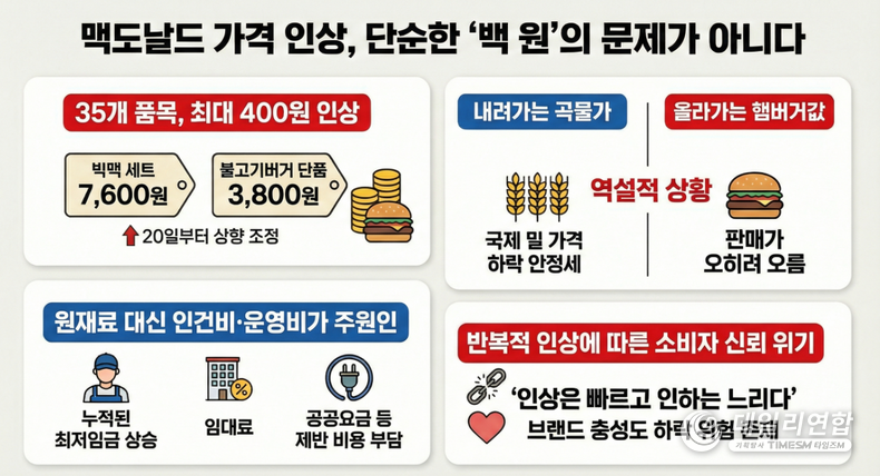 데일리연합 (SNSJTV) 김민제 기자 | 글로벌 패스트푸드 브랜드 맥도날드가 20일부터 햄버거와 음료, 사이드 메뉴 등 35개 품목 가격을 100~400원 인상한다. 지난해 3월 이후 11개월 만의 가격 조정이다. 대표 메뉴인 빅맥 단품은 5천700원으로 200원, 세트는 7천600원으로 오른다. 불고기버거 단품은 3천800원으로 200원 인상된다. 후렌치후라이(M)와 탄산음료(M)도 각각 100원씩 오른다.