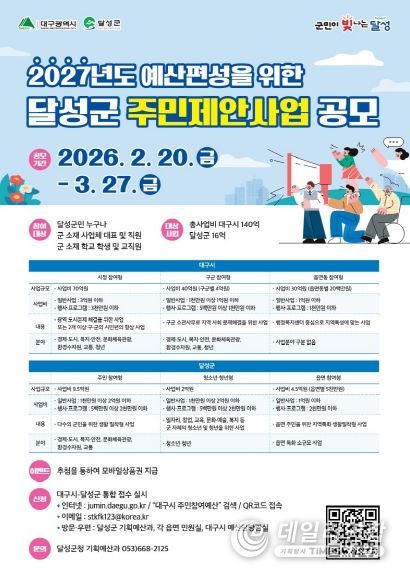 데일리연합 (SNSJTV) 김민제 기자 | 대구 달성군은 2026년 주민제안사업을 2월 20일부터 3월 27일까지 공모한다고 밝혔다.