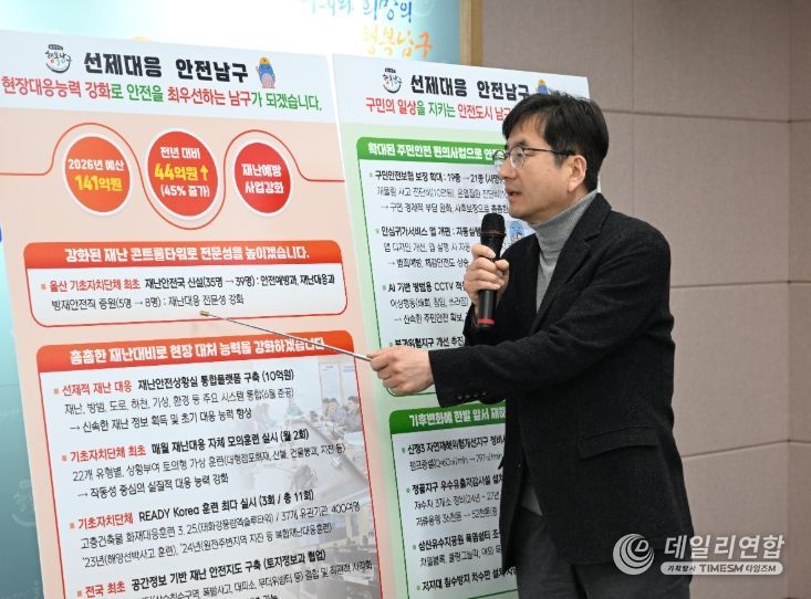 데일리연합 (SNSJTV) 장우혁 기자 | 울산 남구는 24일 남구청 프레스센터에서 정례브리핑을 열고 재난의 대형화·복합화와 기후변화에 따른 자연재난 증가에 대응하기 위해 재난안전국 중심의 통합 안전관리 체계 구축과 재해예방 인프라 확충을 포함한 2026년 종합 재난안전 정책을 본격 추진한다고 밝혔다.