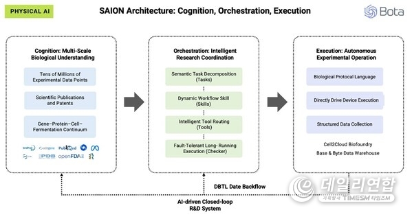 보타의 독자적인 생물학적 프로토콜 언어(Biological Protocol Language)를 통해 사이온 AI는 실험 설계를 실험실 하드웨어를 직접 구동하는 표준화된 명령으로 변환하고, 실제 데이터를 다시 인지 계층으로 피드백하면서 지속적인 모델 개선과 연구개발 가속화를 구현한다.