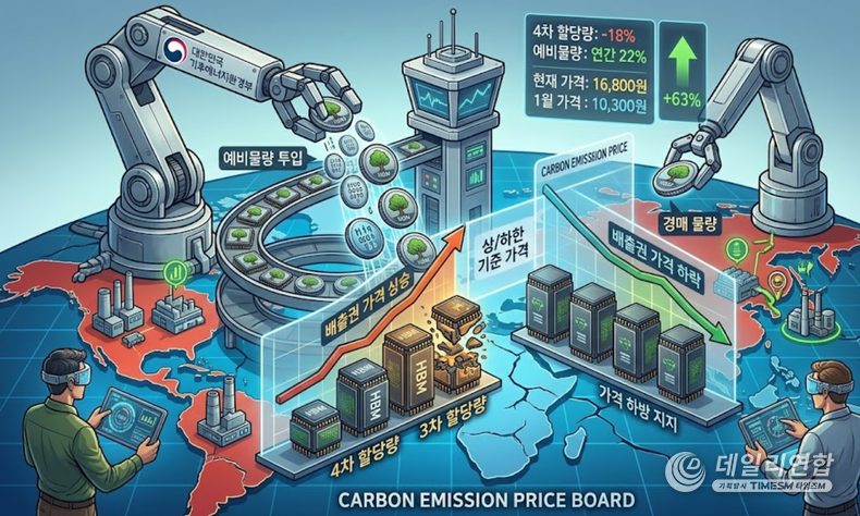최근 배출권 가격이 급등한 근본적인 원인은 '제4차 배출권거래제 기본계획(2026~2030년)'에 따른 공급 절벽 우려에 있다. 4차 계획 기간의 기업별 무상 할당량은 지난 3차 대비 약 18% 감소했다. 탄소 배출 허용치 자체가 줄어들자 시장에서는 향후 배출권 부족 사태를 예견한 '매수 우위' 현상이 두드러졌고, 이는 가격을 단기간에 1만 6800원까지 끌어올리는 기폭제가 됐다.