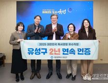 데일리연합 (SNSJTV) 김민제 기자 | 대전 유성구가 ‘2025 대한민국 독서경영 우수 직장’ 인증을 받아 대전 자치구 중 최초로 2년 연속 인증을 획득했다고 6일 밝혔다. 독서경영 우수 직장 인증제는 문화체육관광부와 한국출판문화산업진흥원 주관으로, 직원의 독서 활동을 장려하고 독서를 통한 조직 문화 개선을 실천하는 기관·기업을 대상으로 심사를 통해 인증을 부여한다. 유성구는 ‘독서를 통한 지식 창출과 사회적 소통’이라는 독서경영 비전 아래 2023년부터 다양한 프로그램을 운영하고 있다. 올해는 직원이 추천 도서를 행정시스템 게시판에 소개하고 다음 추천자를 지목하는 독서 릴레이 캠페인(내 인생 한 권의 책)을 진행해 총 23권의 도서가 추천됐다. 또한, 바쁜 업무 환경으로 도서관을 방문하기 어려운 직원을 위해 8개 공공도서관의 책을 사무실로 배송하는 ‘북켓배송’ 서비스를 운영했으며, 352명의 직원이 658권을 전달받았다. 이와 함께 직원휴게실 내 작은도서관을 운영해 직원 기부로 도서를 확충하고, 자율적인 독서 문화를 조성하기 위한 공간으로 활용하고 있다. 정용래 유성