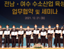 데일리연합(월간, 한국뉴스신문) 이종봉 기자 | 전라남도와 여수산단 입주기업이 미래 청정에너지인 수소 관련 산업을 선도하기 위해 손잡고 나섰다. 전남도는 21일 여수시청에서 김영록 전남도지사, 권오봉 여수시장을 비롯해 GS칼텍스, 롯데케미칼, 한화/글로벌, 여천NCC, 에어리퀴드코리아, 한양 등 여수산단 주요 기업과 발전공기업 등 13개 기관이 참석한 가운데 ‘수소산업 육성 업무협약’을 했다. 이번 업무협약을 계기로 발전공기업과 여수산단 기업은 오는 2025년까지 수소․암모니아 혼소발전, 수소발전 실증 및 연구개발, 수소연료전지발전소(100㎿) 구축, 액화수소 생산설비 구축을 통한 액화수소 충전소 설치 등을 추진할 계획이다. 장기적으로는 2030년까지 1조 8천억 원을 투자해 탄소포집 기술과 연계한 블루수소를 생산하고 그린수소와 암모니아 수입을 위한 수소 전용 항만터미널을 여수·광양항에 구축한다는 복안이다. 전남도와 여수시는 기업의 탄소중립 노력이 성공적인 결실을 보도록 정책 지원, 인허가 등 행정적 지원에 역량을 집중한다. 김형일 한양 대표이사는 “전남도, 여수시, 여러 산단 기업체와 업무협약을 해 매우 기쁘다”며 “이번 협약이 여수와 전남의 수소산업 생태