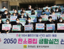 데일리연합(월간, 한국뉴스신문) 이종봉 기자 | 전라남도는 2050 탄소중립 실현을 위해 30일 공공기관이 선도하는 탄소중립 생활 실천운동 릴레이 캠페인을 시작했다. 탄소중립 생활 실천 캠페인은 생활 수칙 10가지 중 하루에 4가지 이상 실천하는 탄생 천사(탄소중립생활 실천 1004) 챌린지 방식으로 진행했고 전남도 모든 실국과 직속기관, 사업소는 물론 22개 시군 등 모든 행정기관이 참여할 예정이다. 먼저 전남도 본청이 실국별 릴레이 방식으로 탄소중립 생활 실천을 선언하고 실천운동을 적극 추진하고, 22개 시군과 유관기관 등 전남도 모든 행정기관으로 확대할 방침이다. 릴레이 첫날인 30일 탄소중립 주관부서인 환경산림국에서 탄소중립 생활 실천을 선언하고, ‘종이타월 대신 개인 손수건 이용하기’, ‘일회용컵 대신 다회용컵 이용하기’, ‘난방온도 2℃ 낮추고, 냉방온도 2℃ 높이기’, ‘컴퓨터 절전 기능 이용하기’ 4가지를 실천하기로 약속했다. 이날 환경산림국 직원들은 상자를 재활용해 만든 탄소중립 생활 실천 피켓을 이용해 퍼포먼스를 진행하였고 종이타월 사용을 자제하고 탄소중립 실천을 유도하는 개인 손수건 사용도 인증했다. 서은수 전남도 환경산림국장은 “2050