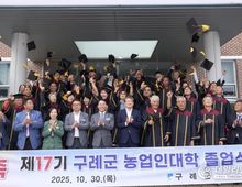 데일리연합 (SNSJTV) 김민제 기자 | 전남 구례군은 지난 10월 30일 기후변화 및 탄소중립 실천 농업인 육성을 목표로 운영해 온 2025년 구례군 농업인대학 졸업식을 개최했다. 이날 졸업식에는 김순호 군수, 장길선 의장, 내빈과 졸업생 등이 참석한 가운데 경과보고, 졸업증서 수여, 축사 순으로 진행됐다. 올해 농업인대학은 ‘친환경 흙 살리기 과정’으로 운영됐으며, 지난 3월 6일 입학식을 시작으로 10월까지 총 25회에 걸쳐 진행됐다. 교육과정은 토양의 구성 및 관리, 토양시비처방서의 이해, 토양 현장진단법, 친환경농자재 실습 등 농업 현장에서 바로 활용할 수 있는 실용 중심의 내용으로 구성됐다. 졸업식에는 36명의 교육생이 교육과정을 이수하며 졸업의 결실을 맺었다. 또한 자치활동과 학습분위기 조성에 기여한 공로를 인정받아 정창현(마산면) 씨가 농촌진흥청장상을, 신한진(문척면) 씨, 김해중(문척면) 씨, 박정남(용방면) 씨가 군수상을 각각 수상했다. 구례군 농업인대학은 2009년 개설 이후 올해까지 17년간 총 21개 과정, 802명의 졸업생 배출했으며 지역 농업의 경쟁력 강화