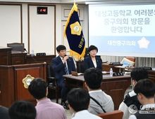 데일리연합 (SNSJTV) 장우혁 기자 | 대전 중구의회는 17일 대전대성고등학교 학생들을 대상으로 의회 견학프로그램을 진행했다. 이번 견학은 학생들이 민주주의와 주민참여의 현장을 직접 체험하고, 대의제의 원리와 기능에 대해 알아보기 위해 마련됐다. 학생들은 상임위원회, 본회의장 등 주요 의회 시설을 둘러보고, 의회와 구의원의 역할, 회의진행 과정에 대한 설명을 청취했으며, 직접 의장석에 안자 의사봉을 두드려보는 체험을 통해 의정 활동에 대한 이해를 높였다. 또한 오은규 의장, 김옥향 부의장과의 질의응답 시간을 통해 학생들은 평소 궁금해했던 조례나 의정활동에 대한 답변을 들으며 생생한 배움의 시간을 가졌다. 오은규 의장은“오늘 견학을 통해 학생들이 의회의 역할과 민주주의의 가치를 배우는 소중한 계기가 됐길 바란다”며, “앞으로도 미래 세대가 올바른 민주의식을 가질 수 있도록 노력하겠다”고 말했다.