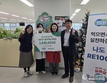 데일리연합 (SNSJTV) 김민제 기자 | 경기도는 24일 경기도청에서 ‘도전! 잔반 제로!’ 캠페인으로 적립한 기부금 284만 8,650원을 초록우산어린이재단에 전달했다. ‘도전! 잔반 제로!’는 경기도청 구내식당을 이용하는 직원들이 1인당 평균 잔반량 목표를 달성하면 당일 결제된 식대의 10%를 적립해 아동 지원단체에 기부하는 캠페인이다. 올해 경기도청 직원들은 1인당 평균 잔반량 50g 미만 3회, 40g 미만 3회, 30g 미만 1회 등 총 7차례 목표 달성에 성공했다. 이를 통해 모인 기부금은 284만 8,650원으로, 지난해 197만 6,450원보다 늘었다. ‘경기도청 임직원 일동’ 명의로 전달된 기부금은 초록우산어린이재단의 기후환경 캠페인 ‘기후변화, 뉴-노멀이 되다’ 사업에 사용된다. 한파 등 이상 기후에 취약한 저소득 가정 아동에게 방한용품과 전기난방용품을 지원할 예정이다. 서기천 경기도 총무과장은 “잔반을 줄이는 일상 속 실천이 탄소 감축을 넘어 기후 취약계층 지원으로 이어졌다는 점에서 의미가 크다”면서 “앞으로도 환경 보호와 나눔을 함께 실천하는 조직 문화를 확산해 나가겠다”고