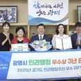 데일리연합 (SNSJTV) 김민제 기자 | 광명시가 경기도가 선정하는 인권 행정추진 우수 기관으로 3년 연속 선정되며 인권 선도 도시로 확고히 자리매김했다. 시는 지난 9월 30일 경기도청 다산홀에서 열린 ‘2025년 경기인권포럼’에서 경기도 인권 행정추진 우수 자치단체 경기도지사 표창을 받았다. 경기도는 31개 시군을 대상으로 인권행정 제도와 정책 추진 성과를 종합 평가해 5개 우수 자치단체를 선정했으며, 광명시는 평가 제도가 도입된 2023년부터 올해까지 매년 수상하는 성과를 거뒀다. 이번 수상은 ▲인권행정 제도 구축(인권조례제정, 인권위원회 구성 및 운영, 인권교육 실시 등), ▲인권정책 수립(인권기본계획 수립 및 연도별 시행계획 수립, 인권실태조사 및 인권영향평가, 인권문화행사 등) ▲지역사회 인권증진 활동 ▲시민 인권 보장과 존중 문화 확산 등 전반적 성과를 전문가들로부터 인정받은 결과다. 광명시는 2012년 지방자치단체 최초로 ‘광명시민인권센터’를 개소하고, ‘인권보장 및 증진 5개년 기본계획’ 수립하는 등 인권 친화적 행정의 기틀을 마련해 왔다. 특히 인권기본계획에 재개발