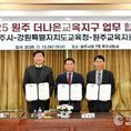 데일리연합 (SNSJTV) 김민제 기자 | 원주시는 지난 18일 시청 7층 투자상담실에서 ‘원주 더나은교육지구’ 지정 연장 업무협약을 체결했다. 협약식에는 원강수 원주시장, 신경호 강원특별자치도 교육감, 김성진 원주교육지원청 교육장이 참석했다. 더나은교육지구는 원주시와 강원특별자치도교육청, 원주교육지원청이 협약을 통해 구축하는, 마을과 학교가 함께하는 지역 교육공동체다. 이번 협약은 1기(2018-2021)와 2기(2022-2025)에 이어 추진되는 3기 사업으로, 2026년부터 2029년까지 4년간 운영된다. 원주시와 도 교육청이 매년 각각 2억 원씩, 총 16억 원의 사업비를 지원한다. 3기 사업 지난 사업 추진 실적을 바탕으로 새롭게 개편됐으며, ‘배움과 성장, 문화예술로 동행하는 원주’를 비전으로 4개의 추진 과제와 12개의 세부 사업으로 구성됐다. 이를 통해 지역과 학교가 함께 성장하는 교육 기반을 더욱 강화할 계획이다. 특히 3기에서는 비전에 걸맞은 다양한 문화예술 프로그램이 추진된다. 원주의 특화 산업인 한지 교육을 통해 민·관·학 협력 분위기를 조성하고, 지역 문화·관광 자원을 직접