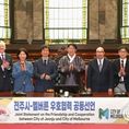 데일리연합 (SNSJTV) 임재현 기자 | 전주시와 호주의 대표도시인 멜버른시가 상호 발전을 응원하는 동반자가 되기로 했다. 우범기 전주시장이 이끄는 전주시 대표단은 현지시간으로 지난 10일 호주 멜버른 시청을 방문해 케빈 로웨이 멜버른 시의원과 오진관 주 멜버른 대한민국 총영사, 마크 코크레인 멜버른 국제협력실 국장, 멜버른 지역 언론사 등이 참석한 가운데 양 도시간 교류를 더욱 발전시키기로 뜻을 모았다. 특히 양 도시는 이 자리에서 우호적 국제관계를 맺는 공동선언에 나섰다. 이날 서명한 협력 체결서에는 △문화예술교류 활성화 △문화산업 및 관광·도시디자인 협력 △지속가능한 문화경제 발전 △공공·민간협력 네트워크 구축 등의 내용이 담겨 있다. 전주시와의 국제교류를 약속한 멜버른시는 호주 빅토리아주 기초자치단체 중 핵심이 되는 도시로, 호주 내에서도 가장 살고 싶은 도시로 선정된 바 있다. 우 시장을 비롯한 전주시 대표단과 멜번시 관계자들은 우호 협력 체결 이후 문화예술과 관광, 스포츠, 경제, 도시디자인, 교육 등 다양한 분야의 교류 확대 방안을 논의하기도 했다. 전주시