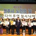 데일리연합 (SNSJTV) 김민제 기자 | 100세 시대를 맞아 전주지역 노인들의 행복하고 건강한 노후생활을 함께 염원하는 노인의날 기념식이 열렸다. 전주시와 대한노인회 전주시지회(지회장 홍성언)는 14일 전주학생교육문화관 공연장에서 우범기 전주시장과 최주만 전주시의회 부의장, 김두봉 대한노인회 전북특별자치도연합회장, 표창 수상자 등 1200여 명이 참석한 가운데 ‘제29회 전주시 노인의날 기념식’을 가졌다. 송민주 대한노인회 전주시지회 사무국장의 사회로 진행된 이날 기념식은 △무지개예술자원봉사단(단장 고대현)과 아름다운 실버 전주의꽃(단장 김인식)의 식전 공연 △노인 강령 낭독 △청려장(장수지팡이) 수여 △전주시장 및 전주시의장 표창 수여식 △노인복지공로자에 대한 공로장 수여식 등의 순으로 진행됐다. 특히 우범기 전주시장은 이날 기념식에서 올해 100세를 맞이한 김옥순 어르신(여, 덕진동)에게 무병장수의 상징인 청려지팡이를 전달했으며, 홍성언 지회장은 축하의 꽃다발을 선물했다. 홍성언 대한노인회 전주시지회장은 “풍성했던 한가위도 지나가고, 땀과 노력으로 이뤄낸 결실의 계절 가을을 맞이해 참석해