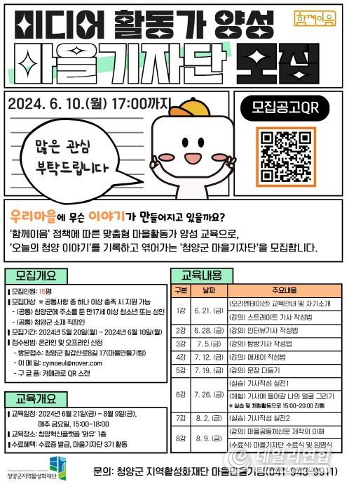 데일리연합 (아이타임즈M 월간한국뉴스신문) 기자 | 청양군은 6월 10일까지 만 17세 이상 청양군민 또는 청양군에 있는 직장인을 대상으로 ‘마을기자단’ 교육에 참여할 수강생 15명을 모집한다고 지난 20일 밝혔다.