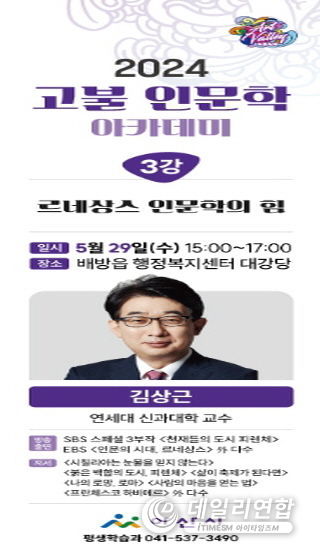 데일리연합 (아이타임즈M 월간한국뉴스신문) 기자 | 아산시는 오는 29일 배방읍 주민자치센터 대강당에서 김상근 연세대학교 교수의 ‘르네상스 인문학의 힘’을 주제로 한 ‘2024 고불 인문학 아카데미’ 세 번째 이야기를 이어간다.