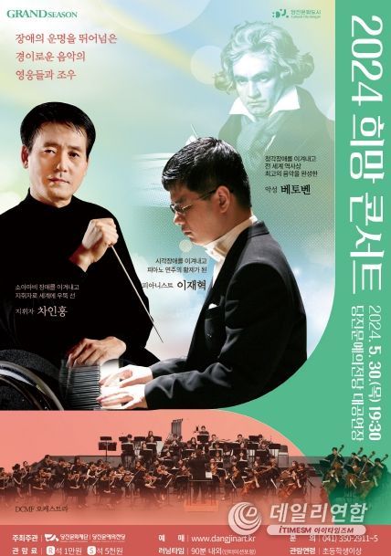 데일리연합 (아이타임즈M 월간한국뉴스신문) 기자 | (재)당진문화재단·당진문예의전당은 5월 30일 19시 30분 당진문예의전당 대공연장에서 ‘장애의 운명을 뛰어넘은 경이로운 음악의 영웅들과 조우 '2024 희망콘서트'’를 개최한다.