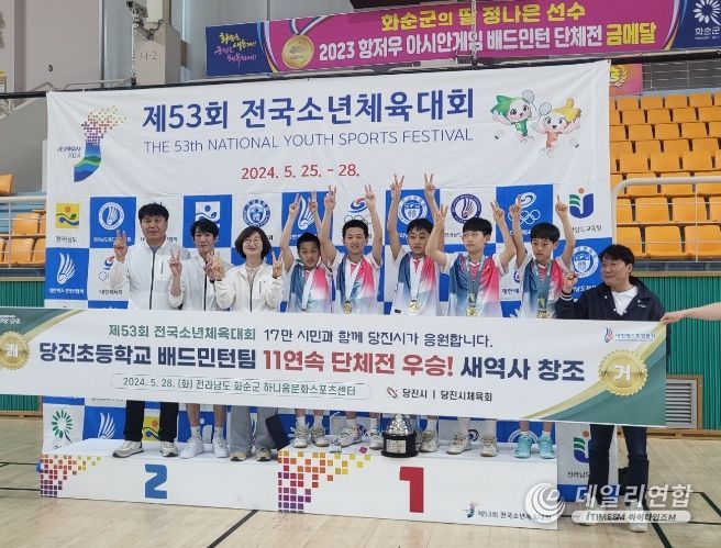 데일리연합 (아이타임즈M 월간한국뉴스신문) 기자 | 당진초등학교 배드민턴팀이 제53회 전국소년체육대회 배드민턴 단체전 우승으로 전국대회 11연패를 달성하며, 새로운 역사를 써나가고 있다.