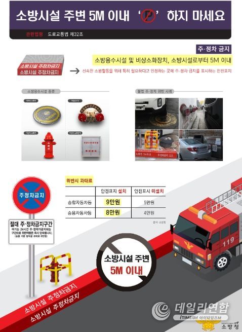 도로교통법 제32조(정차 및 주차의 금지)에 따라 소방용수시설 및 비상소화장치 등이 설치된 곳으로부터 5미터 이내인 곳에는 주·정차를 해서는 안 되며, 이를 위반할 경우 승용차는 8만 원, 승합자동차는 9만 원의 과태료가 부과된다.