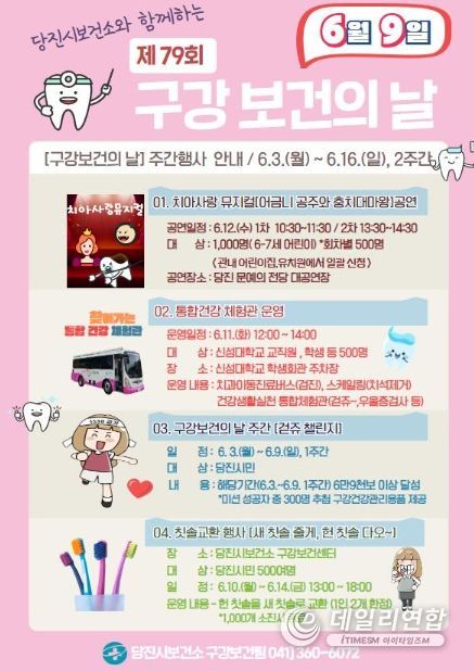 데일리연합 (아이타임즈M 월간한국뉴스신문) 기자 | 당진시보건소는 ‘제79회 구강보건의 날(6월 9일)’을 맞아 다양한 행사를 진행한다고 밝혔다.