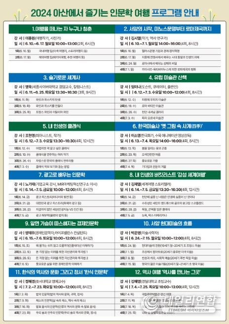 '2024 아산에서 즐기는 인문학 여행'은 ‘유럽 미술관 산책’, ‘내 인생의 클래식’, ‘옛 그림 속 사계(四季)’, ‘광고로 배우는 인문학’, ‘경제 인문학’, ‘한식 인문학’ 등 12개 프로그램이며, 6월 10일부터 7월 25일까지 프로그램별 2~4회(회당 2~3시간) 운영된다.