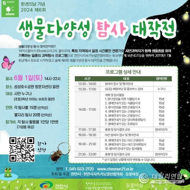 차명국 농업환경국장은 “환경의 날이 있는 6월을 맞아 ‘2030 환경안전도시 천안’ 실현을 위해 생물다양성의 가치와 자연환경 보전의 중요성을 확산시키고 지속적인 환경교육을 추진하겠다”며, “시민모두가 환경보전 활동을 다 함께 실천해 주길 당부한다”고 말했다.
