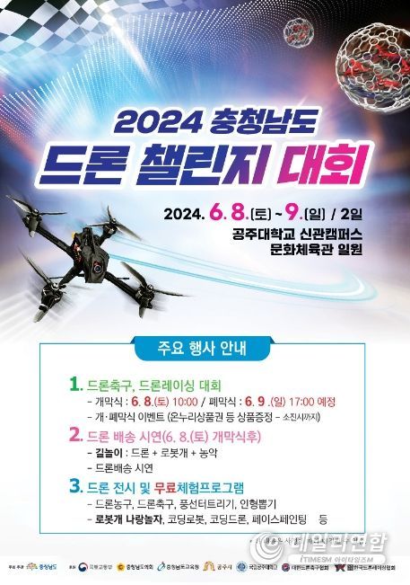 데일리연합 (아이타임즈M 월간한국뉴스신문) 기자 | 충청남도가 주최하고 국토교통부와 공주시가 후원하는 ‘2024 충청남도 드론챌린지 대회’가 오는 6월 8일과 9일 양일간 공주대학교 문화체육관 일원에서 열린다.
