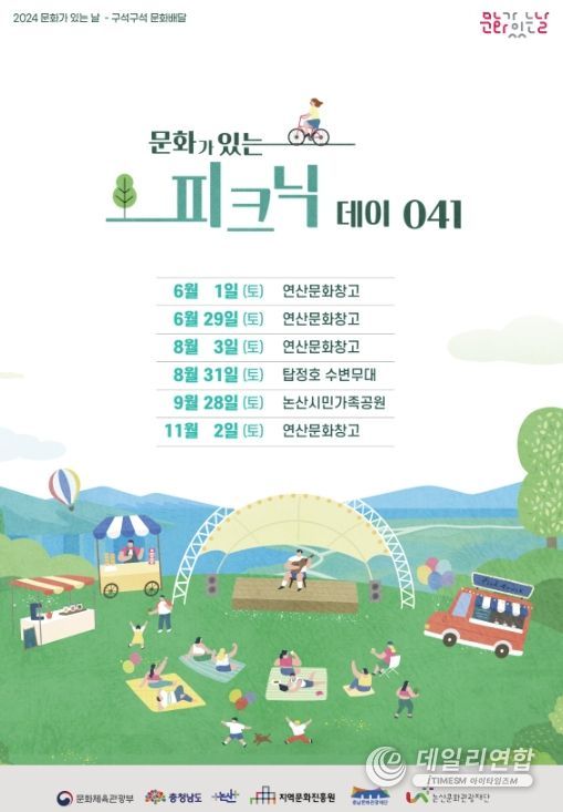 데일리연합 (아이타임즈M 월간한국뉴스신문) 기자 | 논산문화관광재단은‘2024 문화가 있는 날 - 구석구석 문화배달’사업에 선정되어 6월부터 11월까지 '문화가 있는 피크닉 데이 041' 행사를 추진한다.