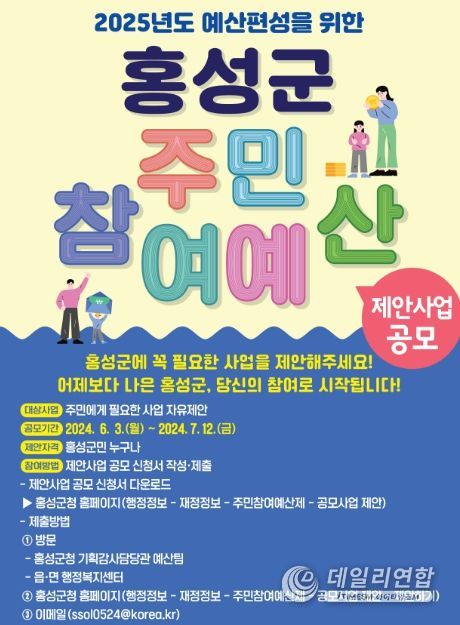 데일리연합 (아이타임즈M 월간한국뉴스신문) 기자 | 홍성군이 예산편성 과정에 주민의 참여기회를 보장하고, 재정 운영의 투명성과 공정성을 높이기 위해 2025년도 예산편성을 위한 주민참여예산 제안사업 공모를 실시한다.