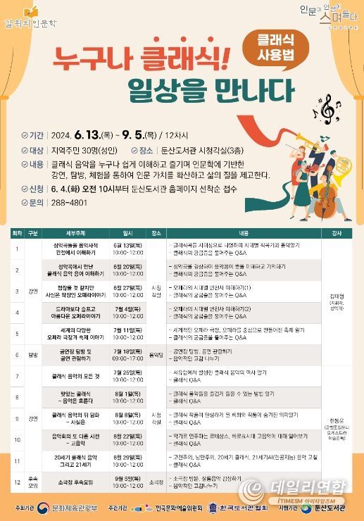 데일리연합 (아이타임즈M 월간한국뉴스신문) 기자 | 대전 서구 둔산도서관은 6월부터 9월까지 클래식 음악을 쉽게 이해하고 즐길 수 있도록 인문학 관점에서 살펴보는 ‘누구나 클래식! 일상을 만나다(클래식 사용법)’라는 강좌를 운영한다.