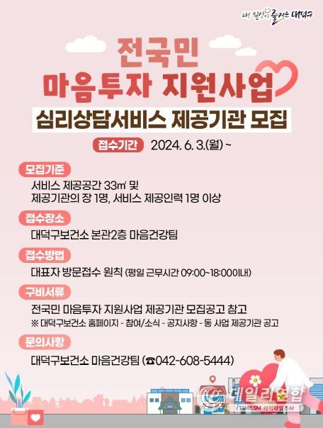 데일리연합 (아이타임즈M 월간한국뉴스신문) 기자 | 대전 대덕구는 오는 6월 3일부터 구민의 자살 예방 및 정신질환 조기발견을 위한 ‘전국민 마음투자 지원사업’ 심리상담 서비스 제공기관을 모집한다고 밝혔다.