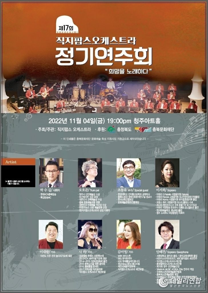 데일리연합(월간, 한국뉴스신문) 이성용 기자 | 제 17회 직지팝스 오케스트라 정기 연주회가 11월 4일(금) 오후 7시 청주아트홀 공연장에서 열렸다.