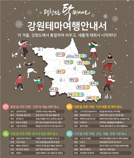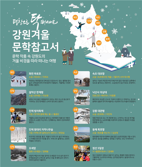 평창 여행의 달 주요 관광지로는 ‘강원테마여행안내서’와 ‘청년강원사용설명서’, ‘강원겨울문학참고서’를 제안한다.