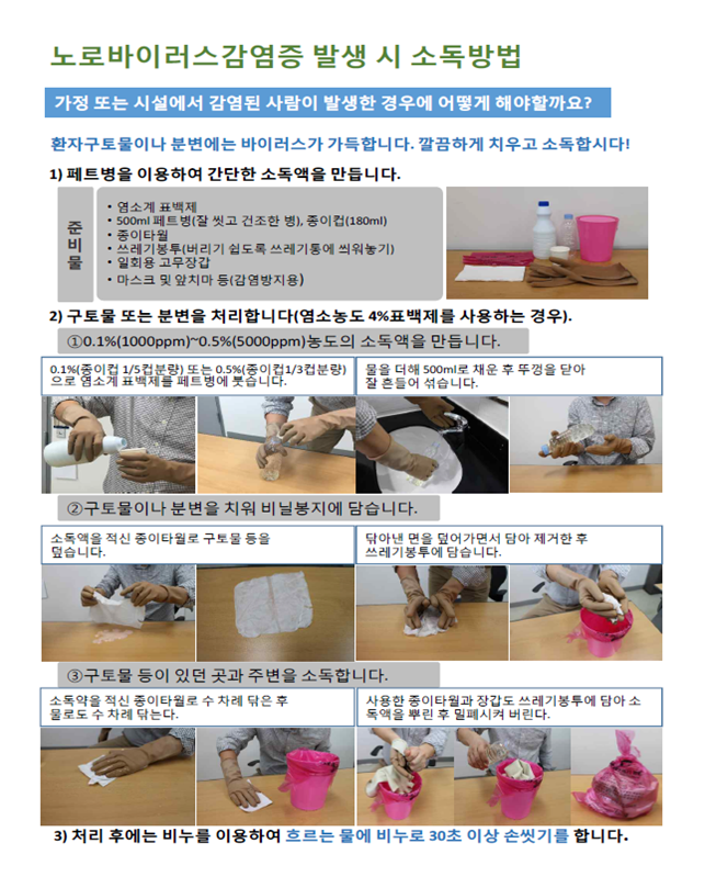 장관감염증을 예방하기 위해, 올바른 손씻기, 익혀먹기, 위생적인 조리과정 준수 등 ‘수인성‧식품매개질환 예방수칙’을 지키고, 음식물 섭취 후 24∼48시간 후 구토, 설사 등이 발생한 경우에 병원에서 진료를 받도록 하고, 오염된 물품, 화장실 등에 염소소독(붙임2)을 한 후 사용하도록 한다.