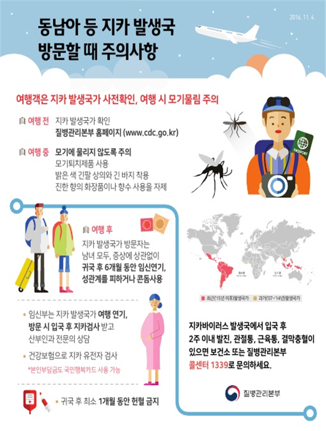 질병관리본부는 해외여행을 계획하고 있는 경우 여행 전 질병관리본부 홈페이지(http://cdc.go.kr) 및 모바일 홈페이지(http://m.cdc.go.kr)를 통해 지카바이러스 감염증 발생국가 현황을 확인할 것을 당부하였다.