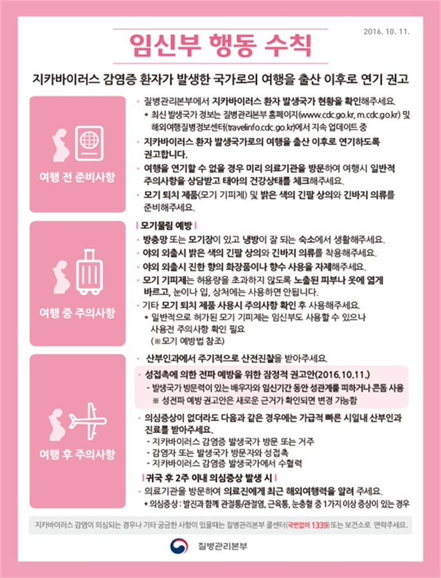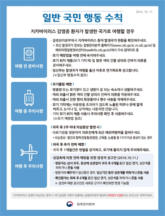 또한, 지카바이러스 감염증 발생국 여행객은 현지에서 모기에 물리지 않도록 하고, 여행 후에도 남녀 모두 6개월간 임신을 연기하며, 금욕하거나 콘돔을 사용하는 등 예방수칙 준수할 것을 당부하였다.