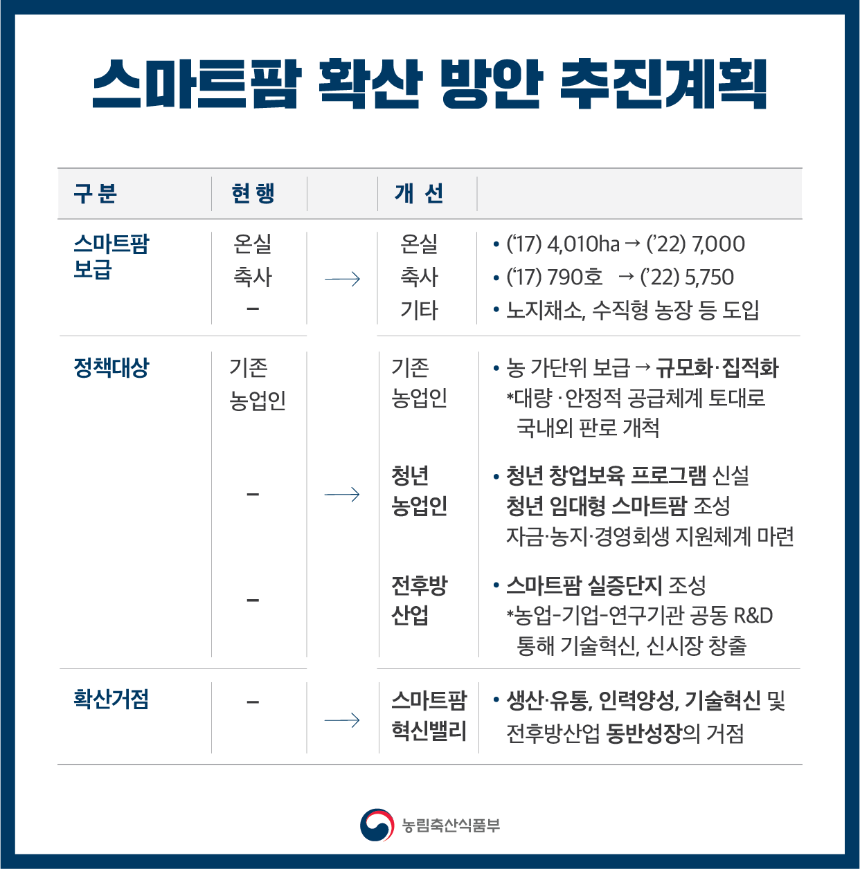 이번 대책을 통해 ‘17년 현재 스마트팜 시설원예 4,010ha, 축사 790호는 ’22년까지 7,000ha, 5,750호까지 확대될 전망이다.