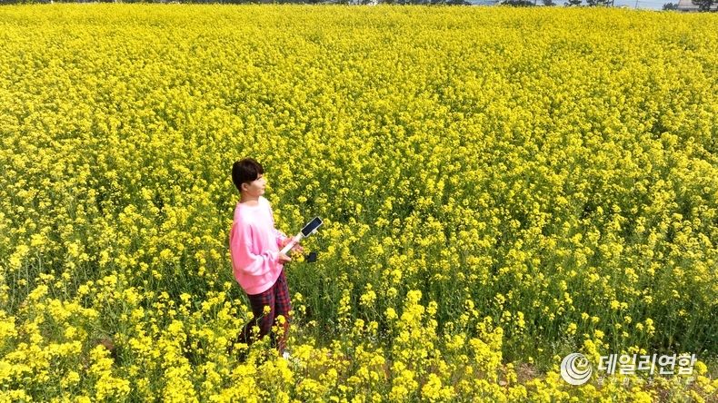 유채꽃 속에서 인생작을 남기기 위한 관광객의 모습 ⓒ 데일리연합 주기범 기자