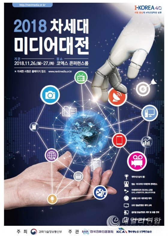 [데일리연합뉴스 이권희기자] 과학기술정보통신부는 올 한해 방송, 스마트미디어 분야의 성과를 공유하고, 4차 산업혁명시대 우리 방송·미디어 산업의 나아갈 방향을 모색하는 ‘2018년 차세대 미디어대전’ 행사를 오는 11월 26일(월), 27일(화) 이틀 간 코엑스(콘퍼런스 룸)에서 개최한다고 밝혔다.