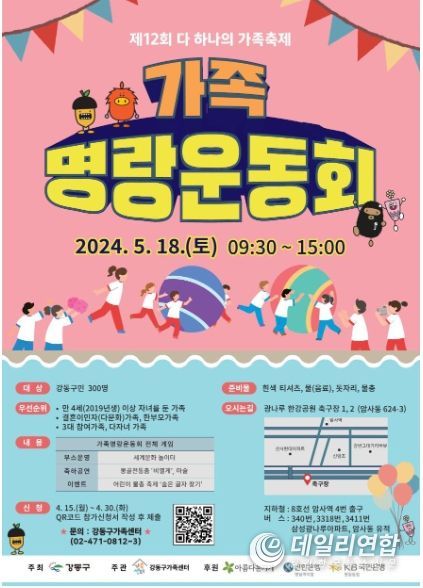 데일리연합(월간, 한국뉴스신문) 박해리 기자 | 강동구는 다가오는 가정의 달을 맞아 5월 18일, 광나루 한강공원 축구장에서 ‘제12회 다 하나의 가족 축제’를 개최한다고 밝혔다.