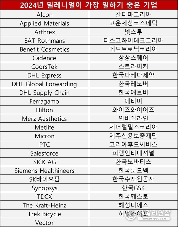 '대한민국 밀레니얼이 일하기 좋은 기업'을 평가할 때는 만 19세에서 34세 구성원들의 신뢰 지수(Trust Index)를 80% 반영하여 지수가 높은 기업을 선정한다. 이번 2024년 '대한민국 밀레니얼이 일하기 좋은 기업'에 선정된 기업은 아래와 같다.