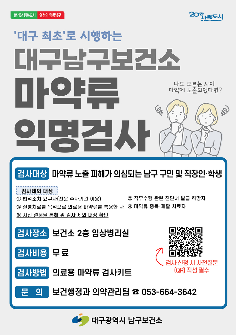 대구 남구는 자신도 모르는 사이에 타인에 의해 마약에 노출되는 마약 범죄로부터 주민을 보호하고 마약류 노출 피해를 조기에 차단하기 위해 '마약류 무료 익명검사'를 실시한다.