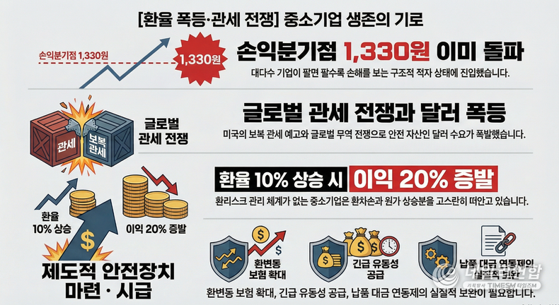 데일리연합 (SNSJTV. 타임즈M) 류승우 기자 | 대한민국 실물 경제의 모세혈관인 중소기업 현장이 비명을 지르고 있다. 헌정사상 초유의 대통령 탄핵 정국이 불러온 국정 공백을 틈타, 미 트럼프 행정부의 전방위적 관세 압박과 이에 따른 원·달러 환율 폭등이 중소기업들의 생존을 정조준하고 있기 때문이다.