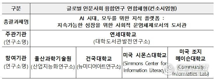 올해 선정된 연합체(컨소시엄)의 연구 주제는 ‘AI 시대 지속가능한 성장을 위한 사회적 운영체제로서의 도서관’으로, 도서관을 데이터 기반의 국가 혁신 플랫폼으로 전환하여 AI 기반 지식 창출의 촉매로 기능하게 하고, AI 리터러시 강화 및 정보격차 해소를 통해 모든 국민에게 필수 데이터 자원을 제공할 수 있는 인프라로서 도서관의 역할과 실행방안을 탐색하고자 한다.