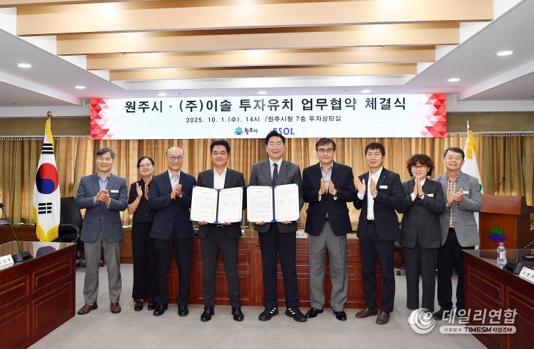 데일리연합 (SNSJTV) 김민제 기자 | 원주시는 10월 1일 오후 2시, 시청 7층 투자상담실에서 ㈜이솔(대표 김병국)과 투자유치 협약(MOU)을 체결했다. 이번 협약은 총 505억 원 규모의 투자로, 부론일반산업단지에 소형 방사광가속기와 첨단 EUV 반도체 검사장비 연구·생산시설을 구축하는 사업이다. EUV(Extreme Ultra-Violet)는 반도체 초미세 공정(7nm 이하)에 필수적인 광원이다.
