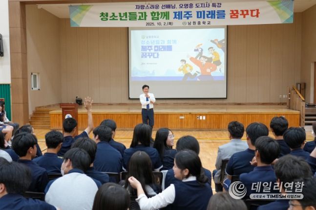 데일리연합 (SNSJTV) 김준 기자 | 오영훈 제주특별자치도지사는 2일 남원중학교(교장 오경석)를 찾아 전교생을 대상으로 특별강연을 열고, “남원과 제주를 넘어 아시아, 나아가 우주까지 여러분의 무대가 돼야 한다”며 청소년들의 꿈과 도전을 격려했다.