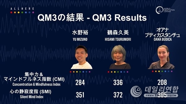 챌린지 참가자인 오아나 부디카스탄쿠(Oana Budicastancu), 츠루모리 히사미(Hisami Tsurumori), 미즈노 유(Yu Mizuno)씨 중 츠루모리씨가 가장 높은 QM3™ 점수를 기록했다. 그녀는 "20년 전 질병에 걸린 일을 계기로 명상을 시작한 뒤 매일 수행해왔다"면서 "삶에서 스트레스와 불안을 느끼는 분에게 명상이 내게 그랬듯 내적 평화를 가져다주길 바란다"고 전했다.