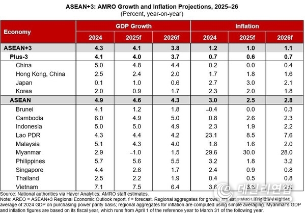 아세안+3 지역의 경제성장률은 2025년 4.1%, 2026년 3.8%로 전망되며, 이는 상반기의 견조한 성장 실적과 예상보다 강한 수출 모멘텀에 힘입어 7월 전망치에서 상향 조정된 것이다. '해방의 날 (Liberation Day)' 관세 발표 이후 4월에 정점에 달했던 시장 압력도 점차 완화되고 있다.